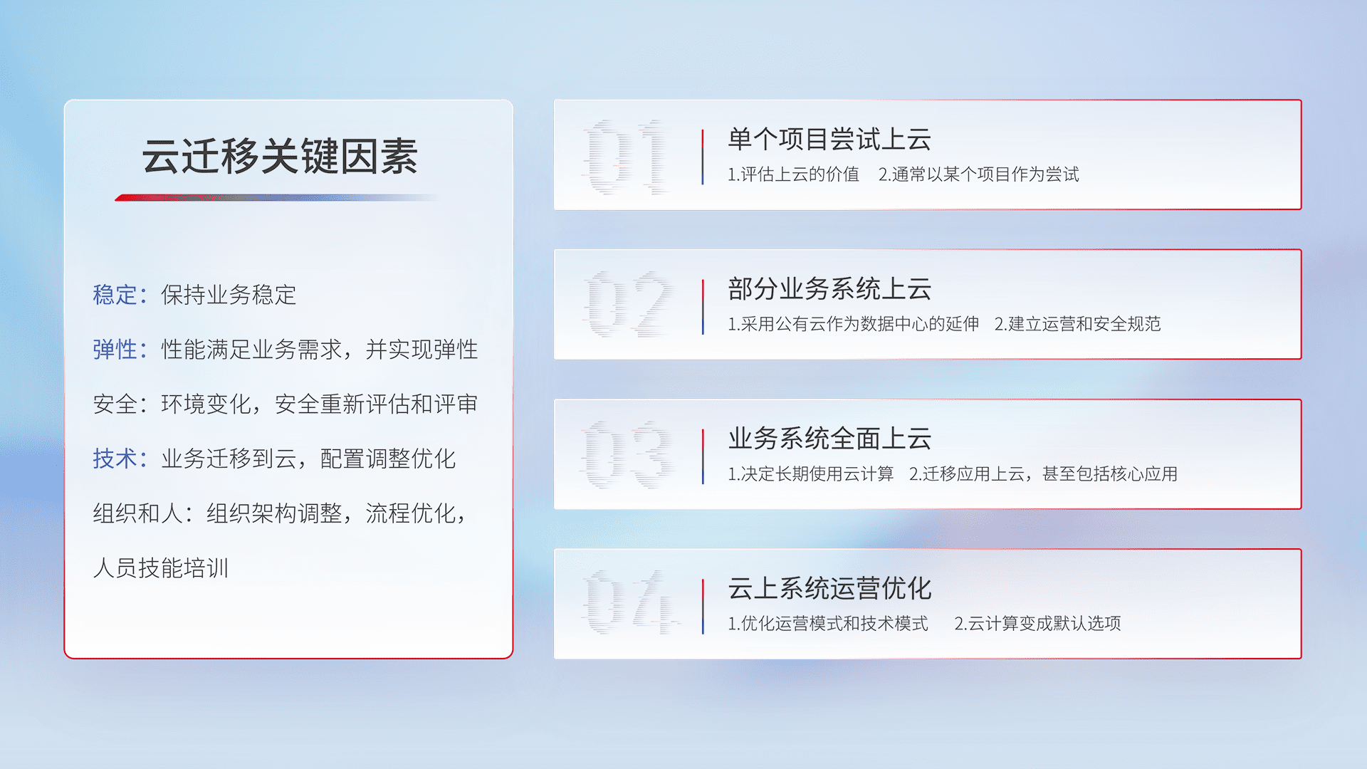 结合实际业务,,,从规划设计、、云平台选型、、、云原生改造、、、、数据迁移、、集成交付,,,,迁移全过程为客户识别最佳上云路径,,做好风险识别管理,,,设计网络架构、、、、身份权限、、、安全审计合规、、操作审计、、、日志审计、、监控告警策略、、、、多站点容灾设计等,,,对云上基础设施进行整体规划,,,,提升IT治理水平,,,,以满足弹性、、、、高可用、、、高性能的需求。。。